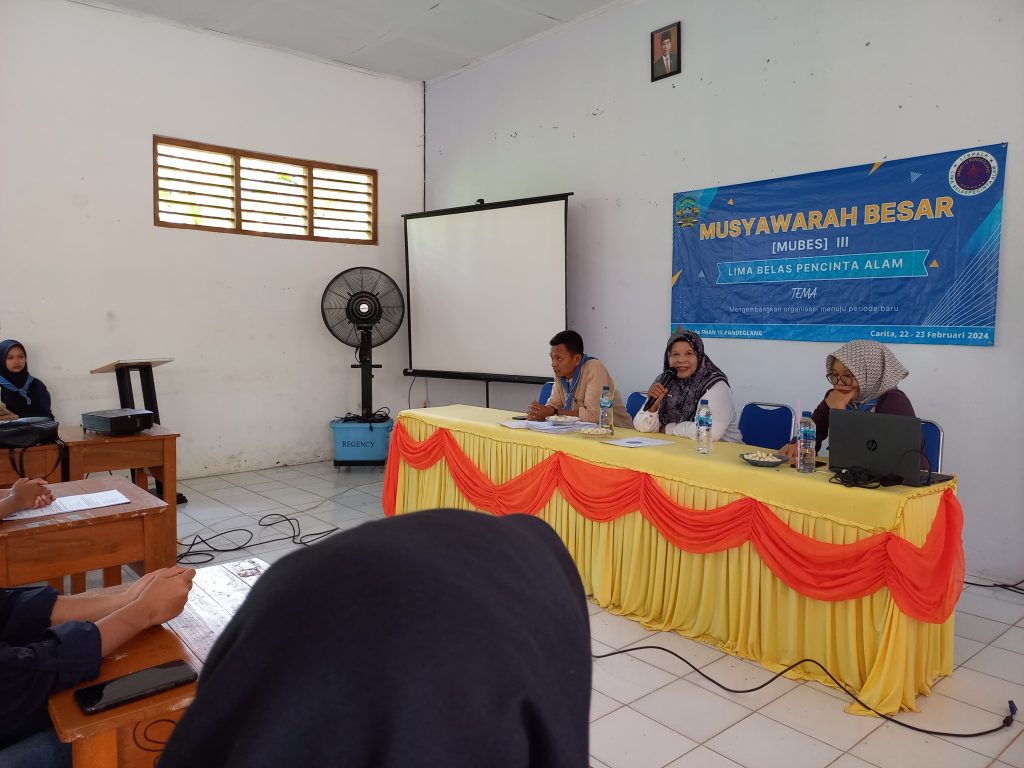 Musyawarah Besar angkatan ke 3 ini mengusung tema “Mengembangkan Organisasi Menuju Periode Baru”. Musyawarah ini dilaksanakan di Aula SMAN 15 Pandeglang pada tanggal 22 sampai 23 Februari 2024 dan dibuka langsung oleh ibu Eha Julaeha, S.E., M.Pd selaku Wakasek Kesiswaan. Menurut beliau diharapkan dengan adanya kegiatan Mubes ke-3 Lispala ini anggota Lispala dapat menjadi pelopor utama untuk peduli terhadap lingkungan.